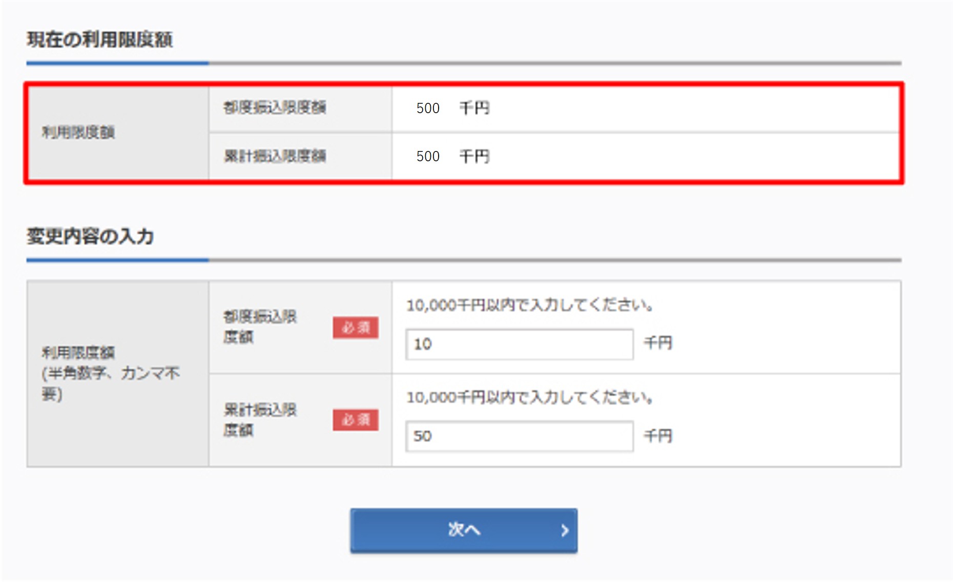 サービス画面へログインのうえ「利用限度額変更」より操作してください。操作手順は以下の通りです。