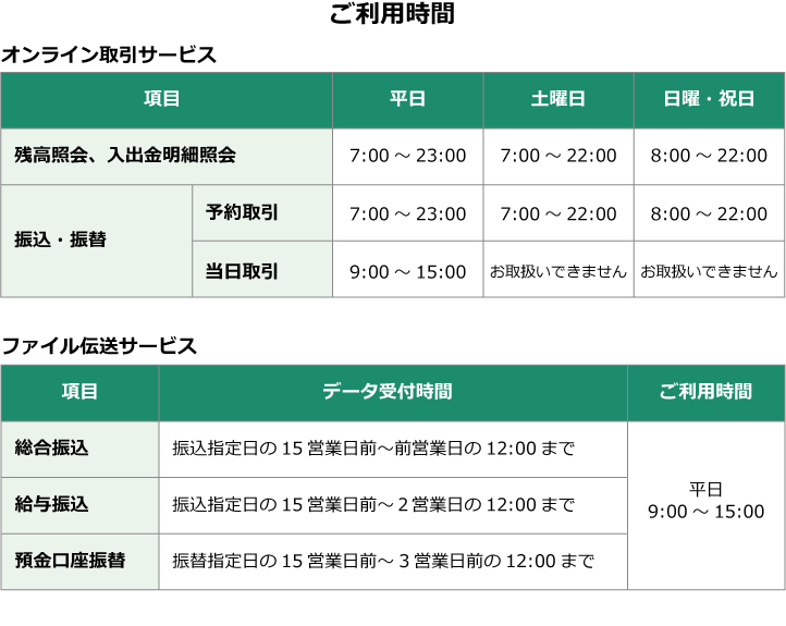 お申込みいただいた代表口座、サービス利用口座の残高・入出金明細をリアルタイムで照会することができます。照会できる時間につきましては「ご利用時間」をご覧ください。