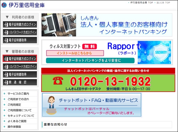 法人インターネットバンキングTOPページ内「管理者のお客様」欄の「電子証明書方式ログイン」をクリック