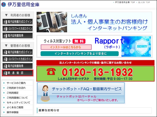 法人インターネットバンキングTOPページ内「管理者のお客様」欄の「開通確認」をクリック