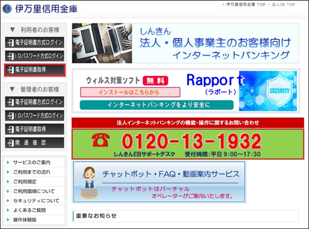 法人インターネットバンキングTOPページ内「利用者のお客様」欄の「電子証明書取得」をクリック