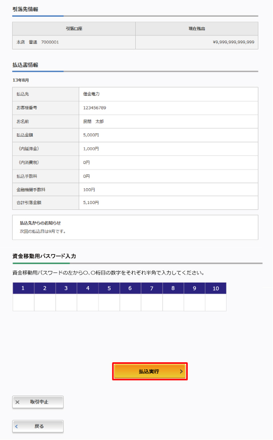 資金移動用パスワードを入力のうえ、「払込実行」をクリック