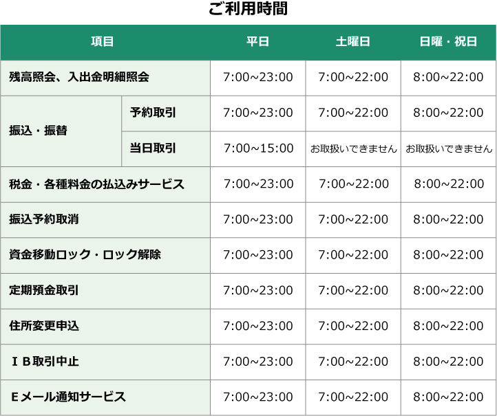 インターネットバンキングをご利用いただける時間につきましては「ご利用時間」をご覧ください。