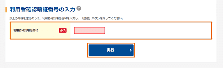 確認後、利用者確認暗証番号を入力し、「実行」をクリック