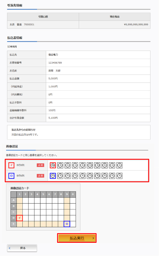 ⑦指定箇所の画像を選択のうえ「「払込実行」をクリック