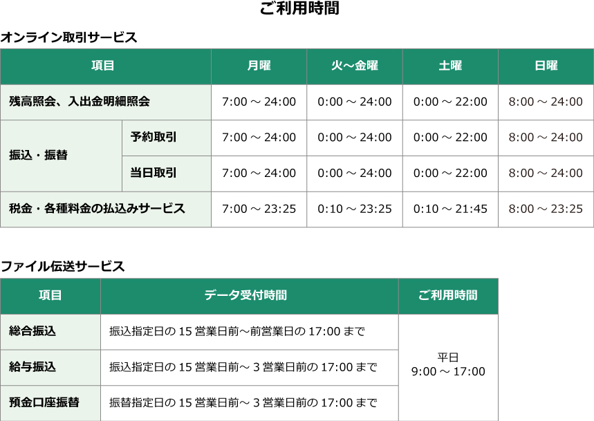 法人インターネットバンキングをご利用いただける時間につきましては「ご利用時間」をご覧ください。