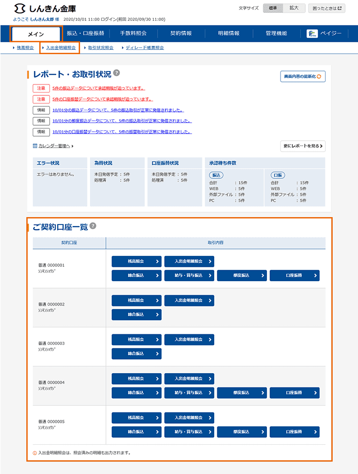 サービス画面にログインのうえ「メイン」メニューの「入出金明細照会」より操作してください。操作手順は以下の通りです。