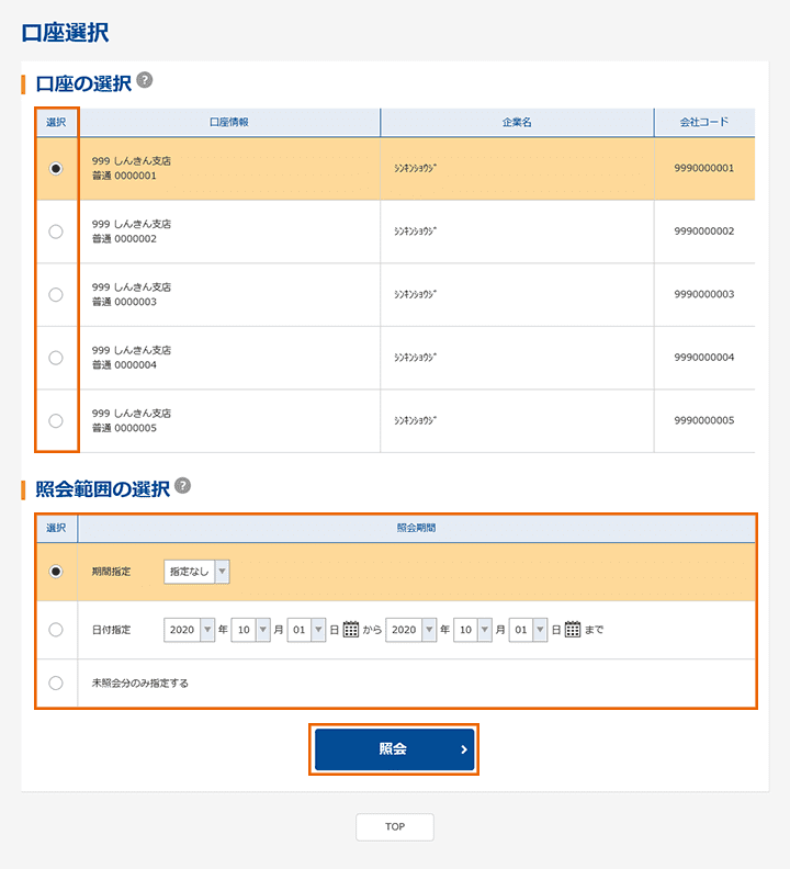 ②照会したい口座・照会期間を選択のうえ「照会」をクリック