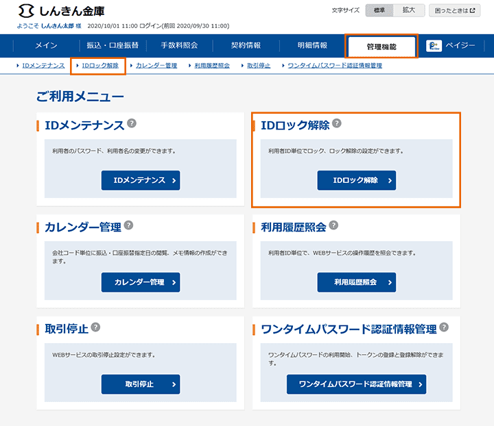 WEB-FBトップ画面の「管理機能」メニュー内、「IDロック解除」をクリック