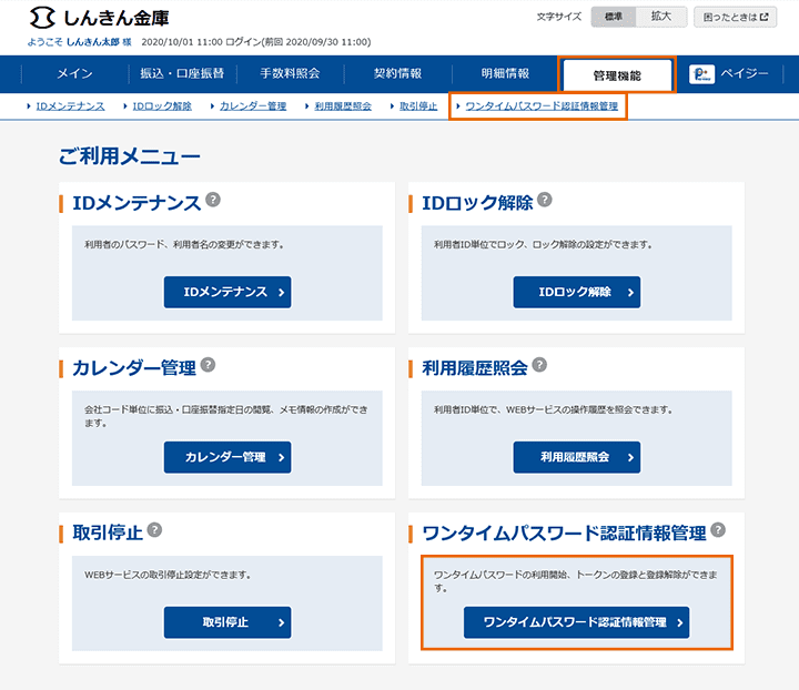 管理者でログイン後、「管理機能」メニューの「ワンタイムパスワード認証情報管理」をクリック
