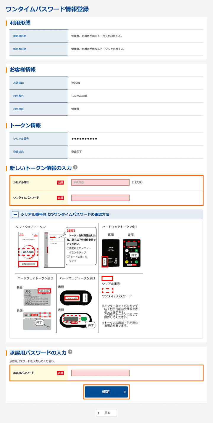 【シリアル番号】、【ワンタイムパスワード】入力欄に、お手持ちのトークンの情報を入力してください