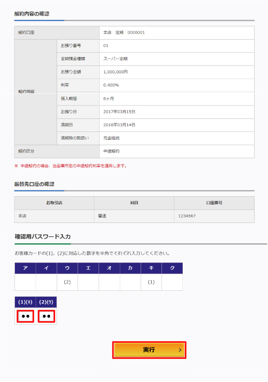 定期預金の解約については、サービス画面へログインのうえ「定期」メニューより操作してください。