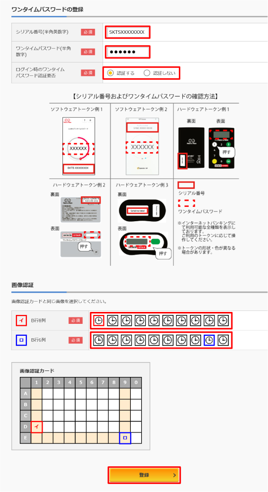 登録するトークンのシリアル番号・ワンタイムパスワード・確認用パスワードを入力のうえ「登録」をクリック