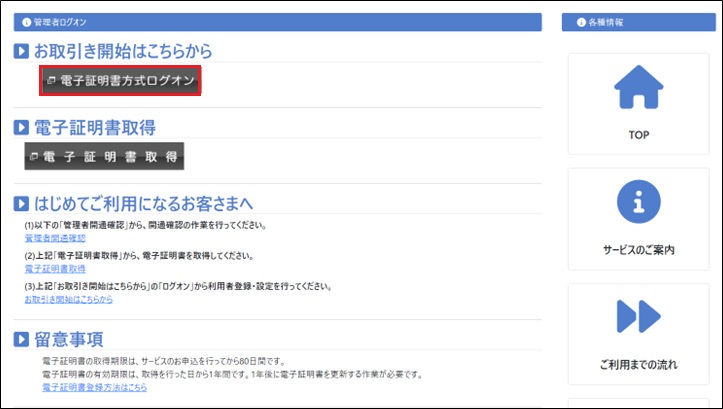 法人インターネットバンキング「管理者ログイン」ページ内の「電子証明書方式ログイン」をクリック