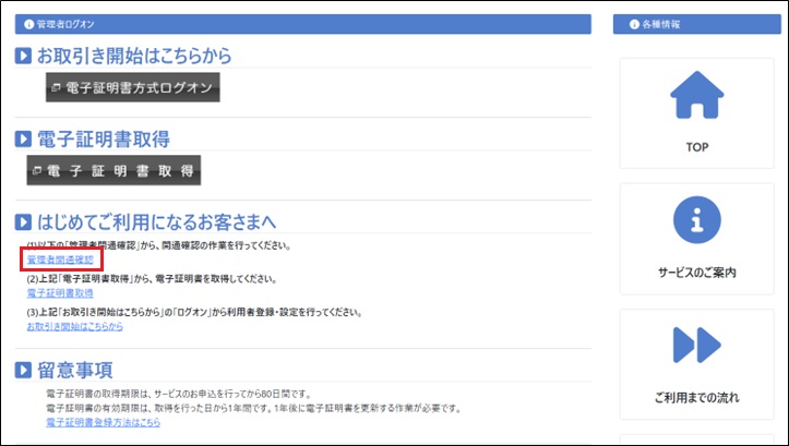 法人インターネットバンキング「管理者ログイン」ページ内の「管理者開通確認」をクリック