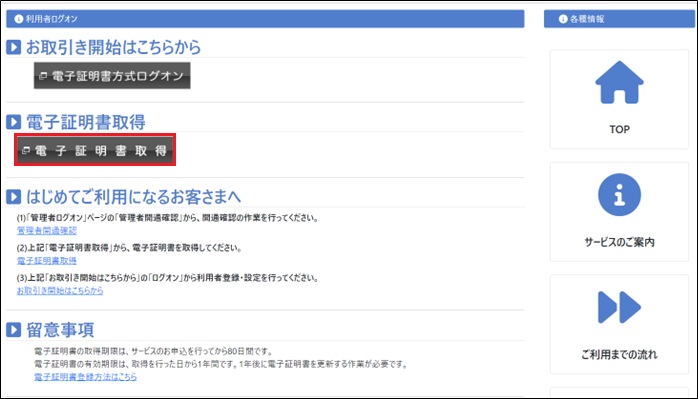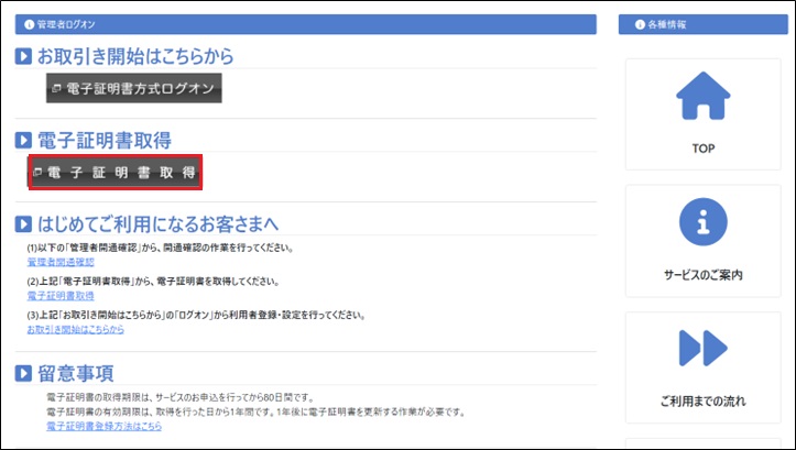 法人インターネットバンキング「管理者ログイン」ページ内の「電子証明書取得」をクリック