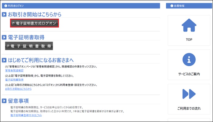 法人インターネットバンキング「利用者ログイン」ページ内の「電子証明書方式ログイン」をクリック