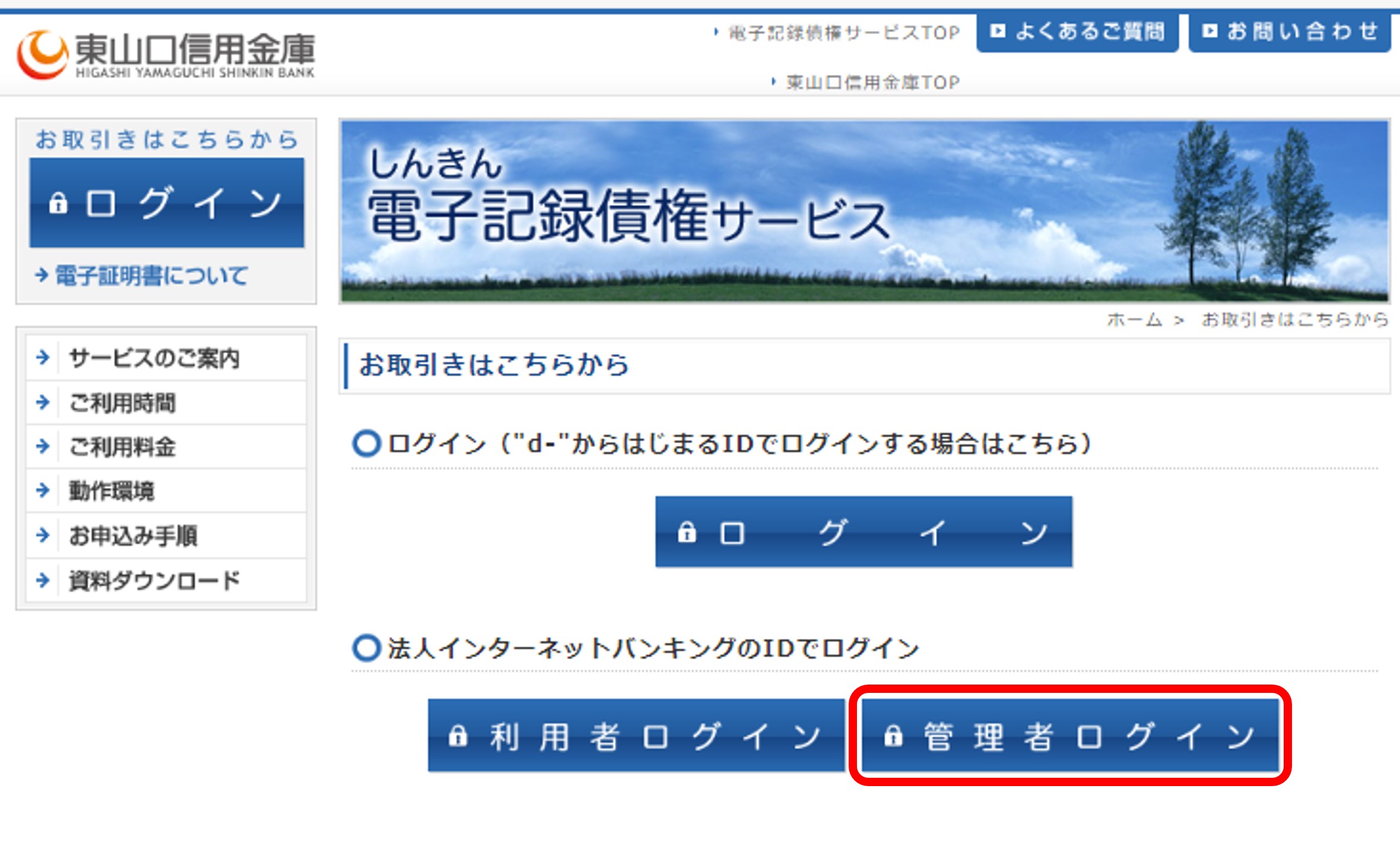 しんきん電子記録債権サービスのページ内「法人インターネットバンキングのIDでログイン(ID共用化を利用する場合)」欄の「管理者ログイン」をクリック