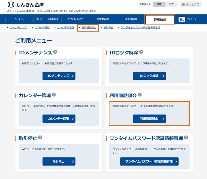 ログイン後「管理機能」の「利用履歴照会」をクリック