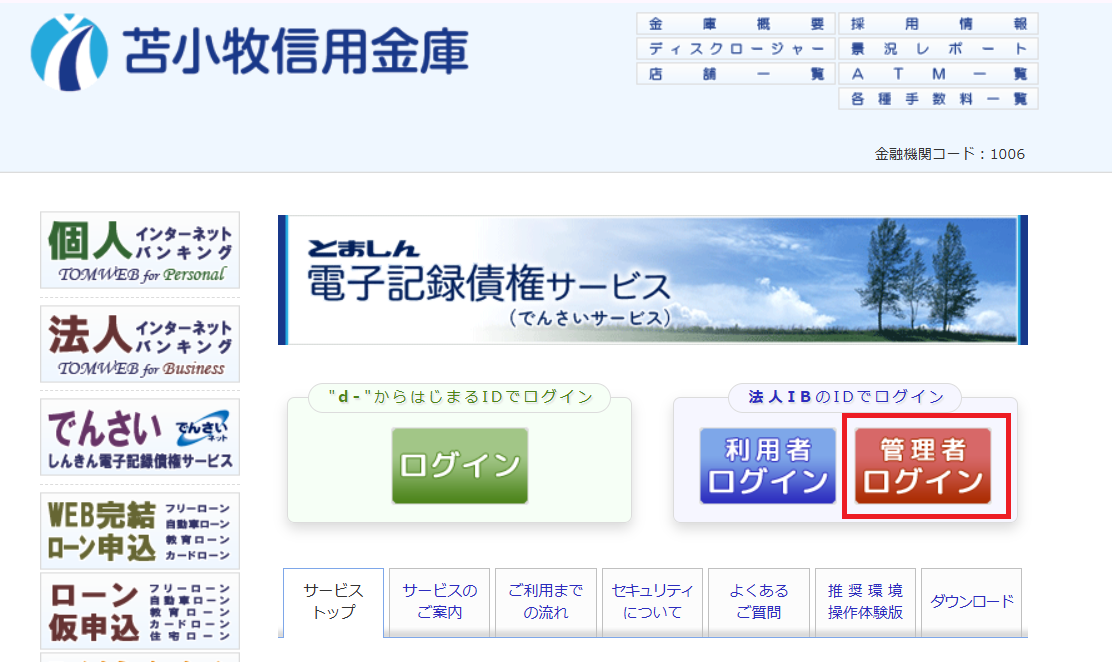 しんきん電子記録債権サービスのページ内「法人インターネットバンキングのIDでログイン(ID共用化を利用する場合)」欄の「管理者ログイン」をクリック