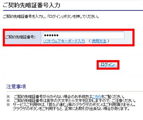 ご契約先暗証番号を入力のうえ、「ログイン」ボタンをクリック